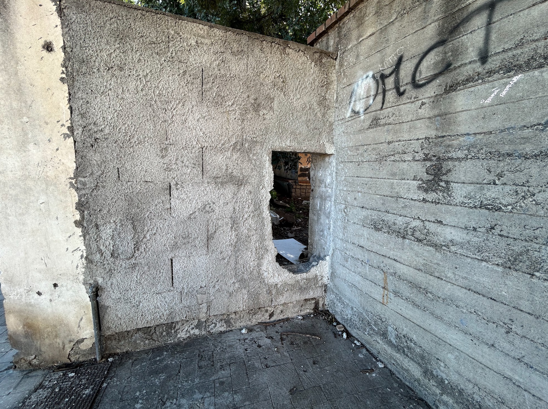 Un varco illegale è stato realizzato nel muro perimetrale esterno del parco, segno del fallimento nel ripristinare la legalità e il decoro urbano. La porzione di muro danneggiata è stata riparata più volte, ma il buco è stato puntualmente riaperto. E ad oggi, nonostante le segnalazioni, rimane lì, in bella vista.