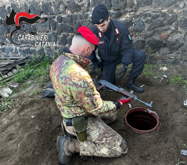 Su disposizione della Direzione Distrettuale Antimafia, i Carabinieri del Nucleo Operativo della Compagnia di Paternò, con il supporto dei colleghi della C.I.O. del 12° Reggimento Sicilia e dello Squadrone Eliportato Cacciatori di Sicilia, hanno eseguito una perquisizione locale presso un terreno ubicato nel territorio di Paternò, in contrada Coscia del Ponte, all’esito della quale hanno arrestato il proprietario del fondo, un 72enne pregiudicato, allevatore locale, perché raggiunto da gravi indizi di colpevolezza in ordine ai reati di detenzione di armi da guerra, di detenzione di armi clandestine e relativo munizionamento, aggravati dalla circostanza di aver commesso il fatto avvalendosi delle condizioni di assoggettamento e omertà previste dall’art. 416 bis c.p. o comunque al fine di agevolare l’attività dell’associazione mafiosa ASSINNATA di Paternò, articolazione territoriale della famiglia SANTAPAOLA – ERCOLANO di Catania.