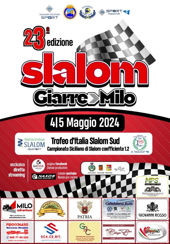 Una gara di destrezza, non di velocità, in cui i piloti dovranno dimostrare tutta la propria abilità, evitando di far cadere i birilli presenti lungo il percorso. Ogni birillo caduto corrisponderà ad una penalità di dieci secondi. La gara, valevole per il Trofeo d’Italia Slalom Sud Aci Sport, lo scorso anno ha registrato un boom di iscrizioni, ben 123, il più alto a livello nazionale per questa specialità. Un successo che lascia ben sperare anche per la 23ª edizione.Lo scorso anno lo Slalom, dopo un lungo ed appassionante testa a testa, si è concluso con la vittoria del messinese Emanuele Schillace, su Radical SR4 Suzuki, seguito a soli quattro millesimi dal campione di casa Michele Puglisi, anch’egli su Radical SR4. Terzo posto per il mazarese Girolamo Ingardia, al volante della Gloria C8. Sabato 4 maggio, quindi, appuntamento con le verifiche e domenica 5 maggio con la competizione, suddivisa in una manche di ricognizione e in tre manches di gara. Anche quest’anno lo Slalom Giarre – Milo verrà trasmesso in diretta sul seguitissimo canale youtube Naxos ProRacing, con la telecronaca di Enzo Amoroso, e sulla pagina Facebook Giesse produzione, con le riprese e la regia di Giuseppe e Salvo Faro. Le iscrizioni alla competizione sono aperte e tutta la documentazione è scaricabile al link: https://bit.ly/3wgPhKF