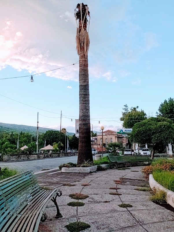 Una palma secca, forse perchè colpita da un punteruolo rosso, potrebbe venire giù in piazza Regina Margherita, Ce lo segnala un nostro lettore che scrive: “In prossimità del busto di Giuseppe Macherione vi è una palma di notevole altezza che si presenta disseccata, probabilmente a causa di un attacco del punteruolo, e che potrebbe anche abbattersi al suolo a causa della marcescenza delle radici. Si informa anche che nella suddetta pianta vi è ancorato un cavo di supporto della pubblica illuminazione con due lampadine”.