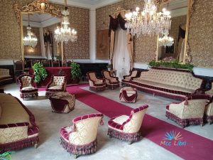 Il Salone degli Specchi è un ambiente straordinario che incarna la bellezza e il prestigio dell’eleganza neoclassica. Le decorazioni, eleganti e raffinate, includono un basamento in marmo e stucchi dorati, mentre le pareti sono decorate con una delicata fantasia di motivi floreali. Il soffitto a padiglione è abbellito da un cornicione e da due splendidi lampadari in cristallo di Boemia, che illuminano l’intero spazio. Al centro del salone si trova un ottagono con una figura femminile mitologica, che cattura l’attenzione di tutti. Il nome “Salone degli Specchi” deriva dai magnifici specchi dorati, che non solo ampliano visivamente l’ambiente, ma riflettono la luce, creando un’atmosfera incantevole. I telai dorati degli specchi si ripetono anche nelle tende delle porte, mentre l’arredamento, con divani e poltrone dalla tappezzeria capitonné, aggiunge comfort e stile. Per accedere a questo splendido salone, si attraversa un salottino neoclassico con decorazioni floreali e un lampadario a quindici luci. Le pareti sono adornate con cariatidi classiche, e specchi ovali insieme a tavolini in legno nero scolpito completano l’atmosfera di altri tempi, accogliente e sofisticata.