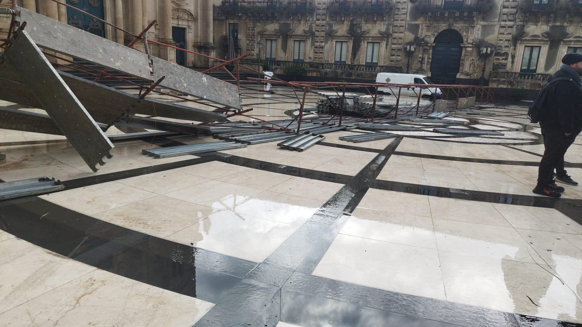 Ad Acireale il forte vento ha divelto la recinzione installata in piazza Duomo per permettere lo sparo dei fuochi d’artificio in onore di Santa Venera.