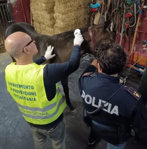 Sempre nell’ambito dei controlli congiunti, la Squadra a Cavallo ed i medici veterinari del Dipartimento di Prevenzione dell’ASP hanno proceduto al controllo di una stalla nel quartiere San Cristoforo. All’interno hanno trovato 4 cavalli, di cui uno privo di identificazione. Tutti gli equidi sono stati sottoposti a fermo ufficiale da parte dei medici, con sanzioni amministrative per il proprietario di 1.500 per mancanza di codice stalla, di 3.000 euro per mancata identificazione di un cavallo e di 2.000 euro per mancanza del test per l’anemia infettiva.
