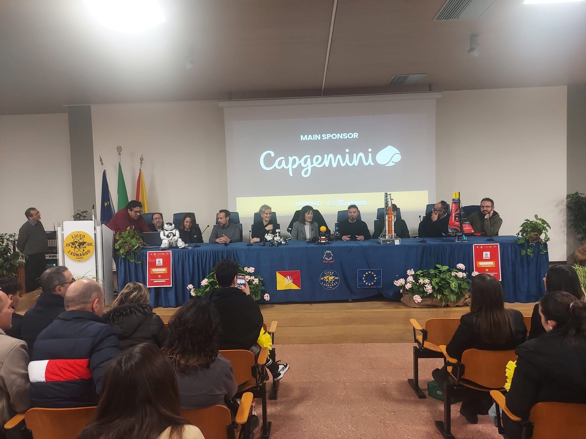 Ad accogliere e a salutare le squadre presenti in un clima di festa e di grande entusiasmo, in aula magna, erano presenti: la dirigente D’Anna, accanto al referente della scuola di Robotica di Genova, Gianluca Pedemonte, al prof. dell’Unict, Dario Grasso e in rappresentanza del StMicroeletronics di Catania, Emanuela Alì, Stem Yuor way coordinator Ct&Pa.