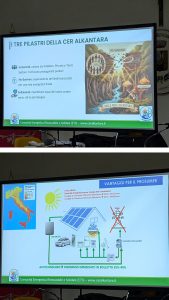 Il presidente della CER Alkantara, Antonino Scuderi, ha preso per primo la parola e ha spiegato in modo semplice cosa sia una Comunità Energetica Rinnovabile. Partendo dagli aspetti giuridici, ha esposto gli obiettivi e le finalità di queste comunità, che puntano a una transizione ecologica condivisa attraverso la produzione, la condivisione e il consumo di energia da fonti rinnovabili.