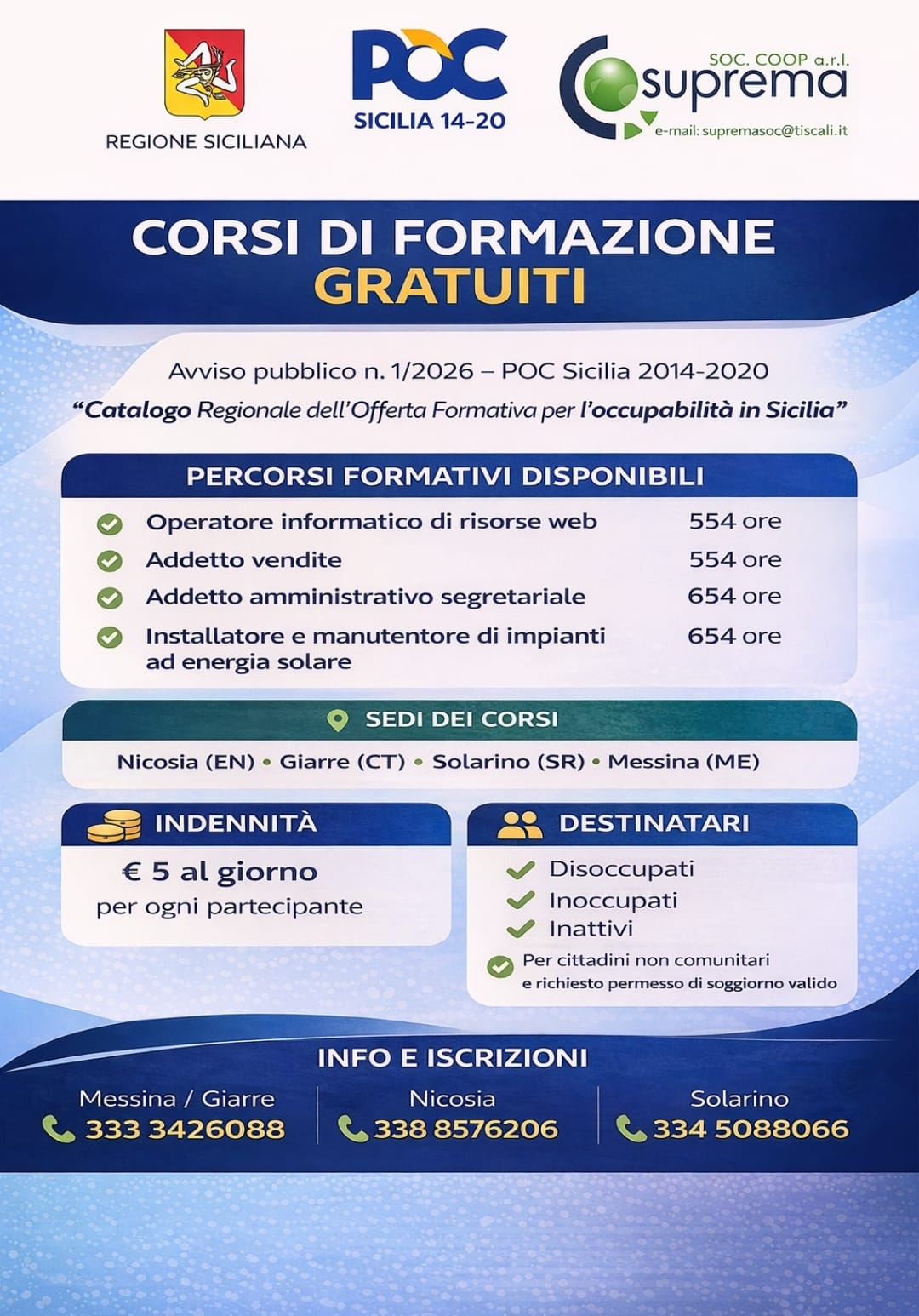 La Suprema società cooperativa, ente di formazione accreditato presso la Regione Siciliana, organizza corsi di formazione gratuiti per disoccupati e persone in cerca di prima occupazione nell’ambito dell’Avviso POC n. 1/2026 – Programma Operativo Complementare POC 2014/202. I corsi rientrano nel Catalogo Regionale dell’Offerta Formativa e i percorsi formativi di qualificazione mirano al rafforzamento dell’occupabilità in Sicilia (Anno 2026).