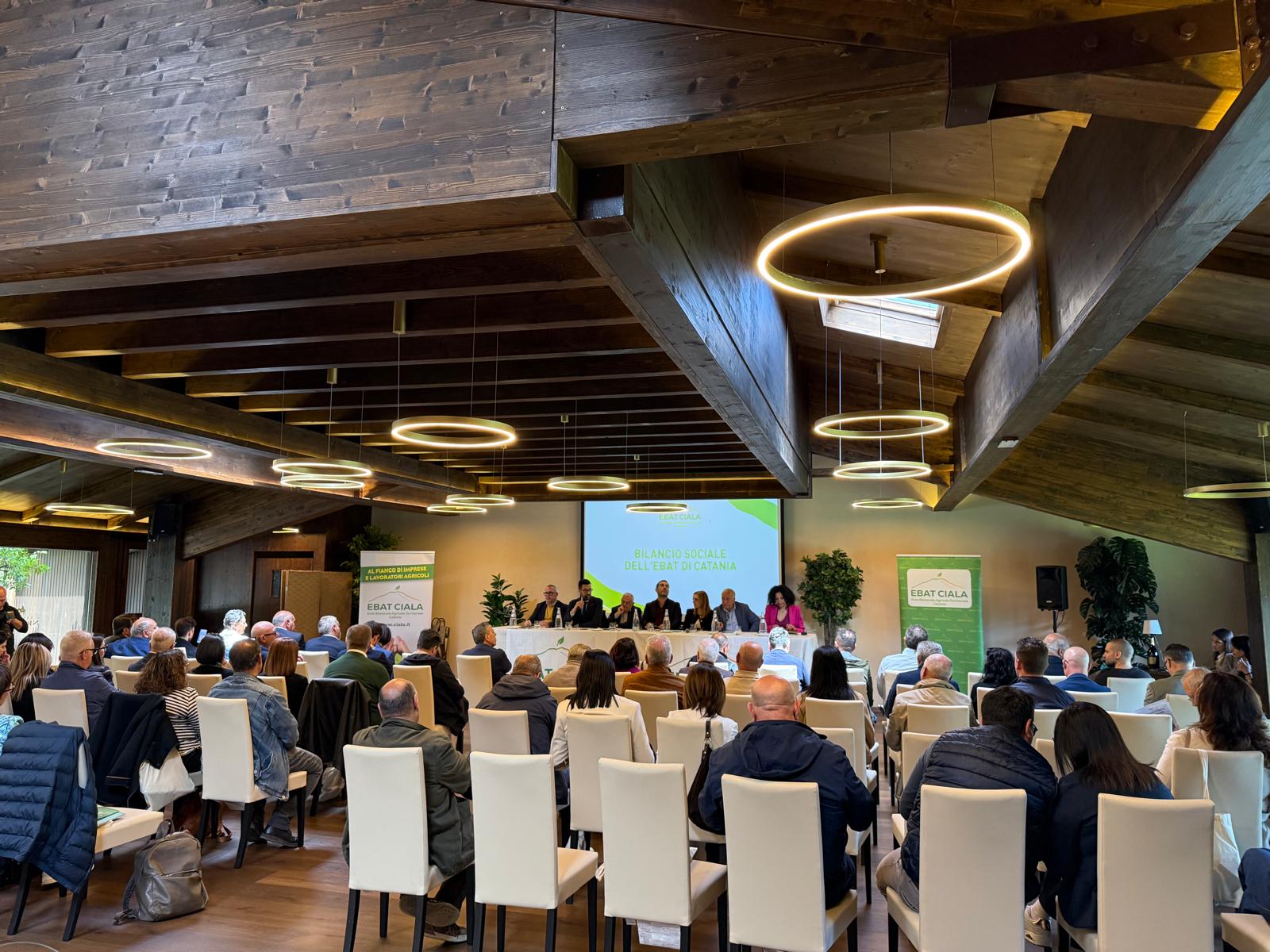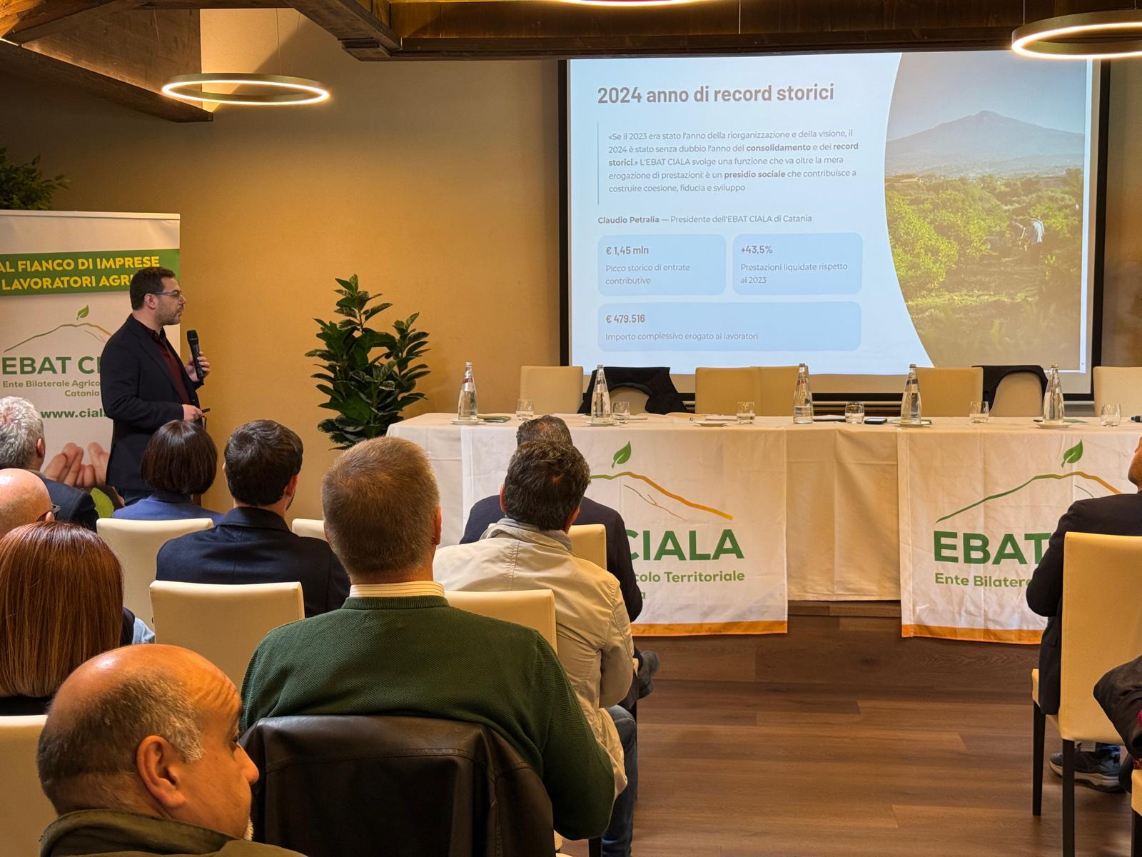 Presentato il Bilancio Sociale 2024 dell’Ebat Ciala Catania, appuntamento centrale per fare il punto sull’andamento del comparto agricolo e sull’attività dell’Ente. A illustrare numeri e servizi il presidente Claudio Petralia (Flai Cgil), alla presenza del Comitato di gestione e dei rappresentanti delle organizzazioni sindacali e datoriali: Alfio Cosentino (vicepresidente – Cia), Nino Marino (Uila Uil), Alfio Turrisi (Fai Cisl), Fabio Caruso (Confagricoltura) e Margherita Milazzo (Coldiretti). Presenti anche Tania Pagano, per l’Eban, e Roberto Prestigiacomo, presidente del Comitato provinciale Inail.